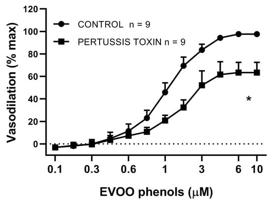 Inactivation of G protein attenuates EVOO phenol-vasodilation. EVOO phenols were tested on mesenteric artery in the absence (control) and in the presence of the specific inhibitor of the GPCR subunit, Gαi, Pertussis Toxin (10 μM,). Data are reported as means ± SEM, n (experimental number), * p < 0.05 refers to the area under the curve.