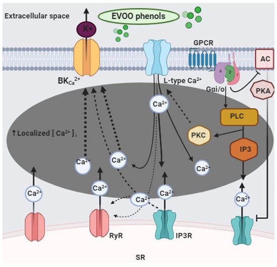 Our results confirm the vasodilation that we showed in our previous study in the same type of artery []. A similar effect was reported in rat aortic rings [,], suggesting that EVOO phenols are vasodilator of both large (conductive) and small (resistance) vessels. Despite recent studies demonstrated the vasodilatory properties of EVOO phenols, the underlying molecular mechanism(s) of vasodilation are not fully known. A canonical mechanism for the vasodilation is the hyperpolarization mediated by potassium channels. We showed that activation of BKCa channels is involved in the EVOO phenol-induced vasodilation of MA. In addition, here we demonstrated that both the release of intracellular Ca2+ from the SR by IP3R and RyR and extracellular Ca2+ influx through the L-type Ca2+ channels are implicated in the EVOO phenols vasodilation. Taken together, our results suggest that EVOO phenols activate BKCa channels potentially through an increase in intracellular localized Ca2+ transients. In agreement with other studies, our data suggest that EVOO phenols may lead to the increase of local Ca2+ microdomains which, in turn, are responsible for the vasodilatory effect on mesenteric resistance arteries. In muscle cells, the release of Ca2+, in the form of Ca2+ sparks, induced by RyR in the sub-plasma membrane of the SR, controls the activity of the nearby BKCa channels in many resistance arteries [,,,]. On the other hand, Ca2+ influx through the L-type Ca2+ channels has been shown to activate BKCa channels in different types of vessels, including hamster and mouse cremaster arterioles [,], rat mesenteric arteries [] and mouse mesenteric arteries []. In striated muscle resistance arteries, both Ca2+ influx through L-type channels and RyR-based Ca2+ sparks, contribute to activation of BKCa channels [,]. Studies in VSMCs from mouse MA [] have shown that Ca2+ influx through L-type Ca2+ channels can directly activate BKCa channels. Furthermore, it has been demonstrated that, in vascular smooth muscle cells, BKCa and L-type Ca2+ channels can directly interact forming complexes that are accumulated in caveolae by the interaction of caveolin-1, thereby regulating spatiotemporal Ca2+ dynamics including the negative feedback, to control the arterial excitability and contractility [].