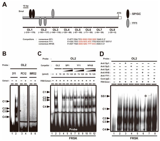 Competitive electrophoresis mobility shift assays (EMSA) and supershift assays with OL2 (−183 to −137) region in the core-promoter region (CPR) of Stx1a. (A): Scheme of OL2 probe and competitors (consensus OL) used with competitive electrophoresis mobility shift assays (EMSA). The consensus sequences of SP, YY1 and NFκB are indicated in red. (B): EMSA with OL2 for binding to nuclear extract of 3Y1 fibroblast cells, PC12 adrenal pheochromocytoma cells and IMR32 neuroblast cells. Arrowheads indicate shift-bands by DNA–protein complexes (C1, C2, C3 and C4). (C): Competitive EMSA with OL2 for binding to nuclear extract of fetal rat skin keratinocyte (FRSK) cells. Arrowheads indicate shift-bands by DNA–protein complexes (C1, C2, C3 and C4). (D): Supershift assay of the OL2–protein complex in FRSK cells. Nuclear extract from FRSK cells was incubated with antibodies for Sp1, Sp3, Sp4, NFκB and YY1 before the addition of the OL2 probe. Arrowheads indicate the shift-band by DNA–protein and DNA–protein–antibody complex. The supershift bands (SS1) by DNA–protein–antibody complex are indicated with asterisks.