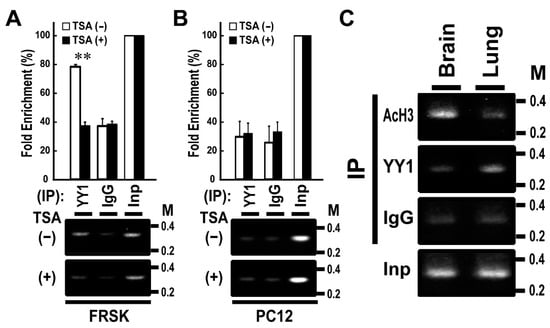 Chromatin immunoprecipitation (ChIP) assays using YY1 antibody in FRSK cells and tissues. (A,B): ChIP assays using YY1 antibody in FRSK (A) and PC12 (B) cells treated with TSA (+) or untreated (−). Chromatin DNA isolated by immunoprecipitation was amplified using primers for the Stx1a-CPR. The data shown are representative images. Values indicate means ± SE (n = 3). ** p < 0.01 compared to the untreated control. (C) ChIP assays using AcH3 and YY1 antibodies in tissues of brain or lung. Chromatin DNA isolated by immunoprecipitation was amplified using primers for the Stx1a–CPR.