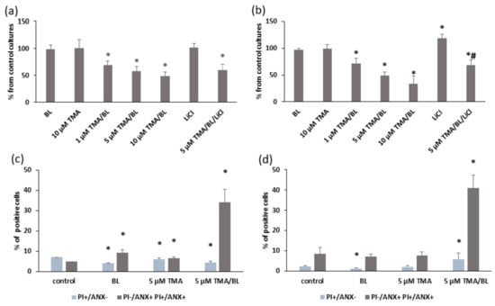 Cell viability (a,b) and apoptosis (c,d) determined by trypan blue staining and a FACS analysis with annexin V (ANX) and propidium iodide (PI), respectively, at 24 (a,c) and 48 (b,d) h after the treatment with TMA, blue light (BL) (2 J/cm2), and 1-mM LiCl. Data were obtained from 3 experiments carried out in triplicate and reported as mean ± SD. * = p < 0.05 vs. untreated cultures taken as the control and # = p < 0.05 vs. 5-µM TMA/BL-treated cells, Student’s t-test.