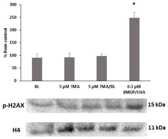 Western blot analysis of the phosphorylated form of the histone H2AX. The cultures were treated with 5-µM TMA/BL (2 J/cm2). Quantification of the expression levels was performed by a densitometric analysis using ImageJ software. Data, normalised to the H4 histone, are reported as percentages from the control cultures. * p < 0.05 vs. control. 8-MOP: 8-methoxypsoralen.
