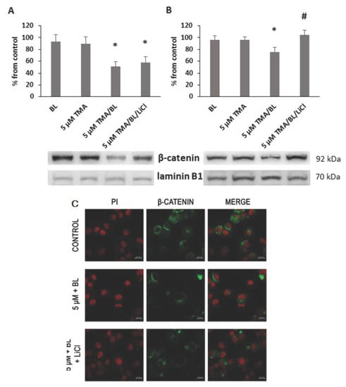 Nuclear expression of β-catenin. At 24 (A) and 48 (B,C) h after the treatment with TMA, BL (2 J/cm2), and 1-mM LiCl, the β-catenin expression was verified by Western blotting (WB) (A,B) and immunofluorescence (C). Quantification of the expression levels was carried out by a densitometric analysis using ImageJ software (A,B). Data were reported as percentages from the control cultures. * = p < 0.05 vs. control cultures and # = p < 0.05 vs. cultures treated with TMA/BL, Student’s t-test. (c) Nuclei and β-catenin-positive areas are in red and green fluorescence, respectively (bar: 20 μm).