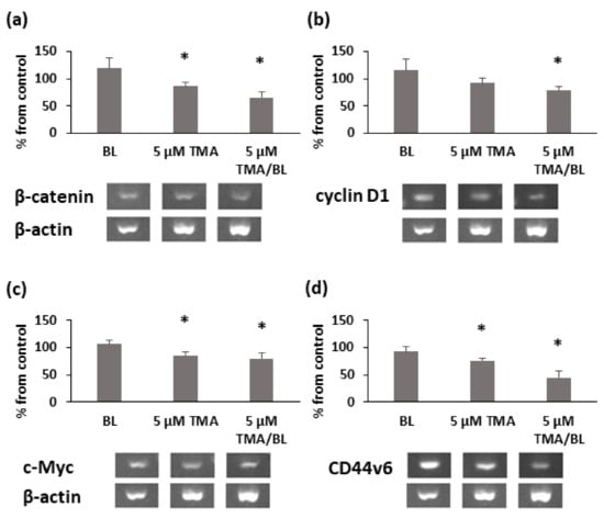 RT-PCR analysis of β-catenin (a), cyclin D1 (b), c-Myc (c), and CD44v6 (d) at 3h after the treatment with TMA/BL (2 J/cm2). Quantification of the expression levels was carried out by a densitometric analysis using ImageLab software. Data were reported as percentages from the control cultures. * = p < 0.05 vs. control cultures, Student’s t-test.
