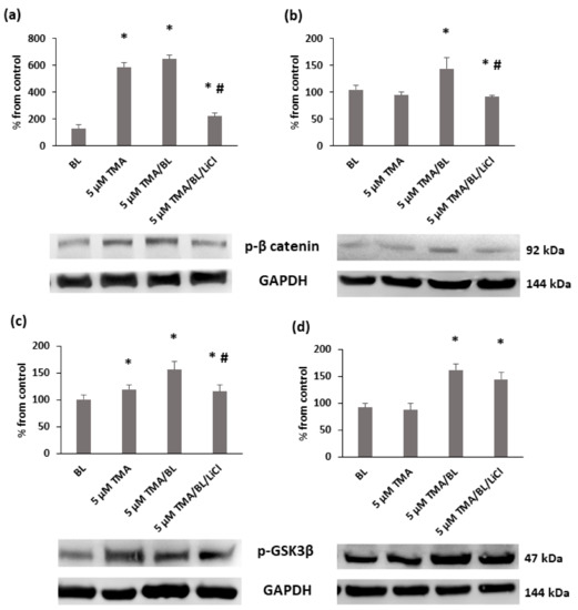 Western blot analysis of the phosphorylated forms of β-catenin (a,b) e GSK3β (c,d) at 24 (a,c) and 48 h (b,d) after the treatment with TMA, BL (2 J/cm2), and 1-mM LiCl. Quantification of the expression levels was carried out by a densitometric analysis using ImageJ software. Data are reported as percentages from the control cultures. * = p < 0.05 vs. the control cultures, # = p < 0.05 vs. the cultures treated with TMA/BL, Student’s t-test.