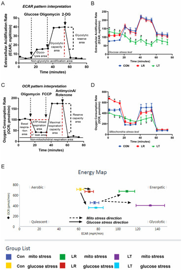 LPS-tolerant RAW 264.7 cells have significantly decreased cellular metabolism compared to LPS-responding and unstimulated cells. The general pattern of the estimation of glycolysis and mitochondrial functions through extracellular acidification rate (ECAR) and oxygen consumption rate (OCR), respectively (A,C); the pattern of macrophages treated with LPS either once (LPS-Responding (LR, red)) or twice (LPS-Tolerant (LT, green)) and untreated control samples (Con, blue) (B,D) (combination from triplicate experiments for B,D), and the energy map calculated using the Seahorse XF Extracellular Flux Assay (E). * = p-value < 0.001.