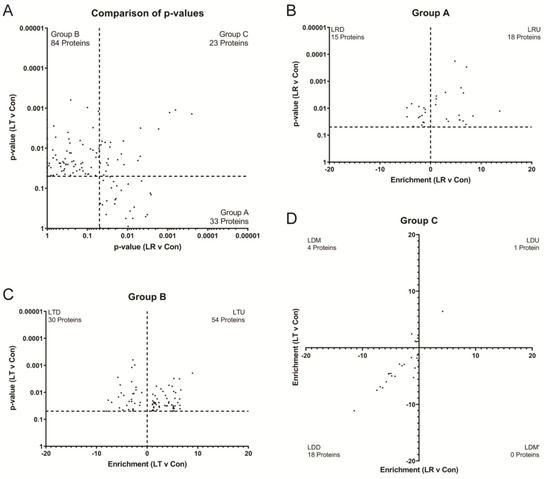 We found that most proteins were found in both treatment groups but had different levels and directions of change compared to the control in both LR and LT conditions. To identify which changes in protein levels were specific to either LR or LT conditions, we plotted the p-values versus the control of each protein in the LR and LT datasets (Figure 4A). This plot identified four clear groups, identified as A through D. Group A proteins had a significant difference (p-value ≤ 0.05) in LR samples and included 33 proteins. Group B had a significant difference (p-value ≤ 0.05) in LT samples and included 84 proteins. Group C had a significant difference (p-value ≤ 0.05) in samples treated with either LR or LT samples and included 23 proteins. Group D had no significant difference following LPS treatment and included 608 proteins (Figure 4A).