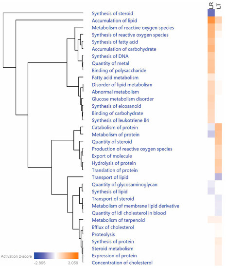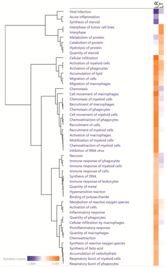 We have hypothesized that cellular exhaustion is related to suppression of the LPS response in sequential LPS treatments. Two pathways that relate to exhaustion are metabolism and the production of reactive oxygen species. By filtering the IPA comparative analysis results only for processes related to metabolism or reactive oxygen species, we found distinct differences between the LR and LT groups (Figure 7). Overall, the LT group has a wide variety of affected processes, with both increased and decreased rates predicted.