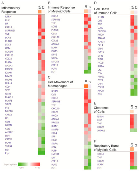 LPS-Responding RAW 264.7 cells’ secretomes include cytokines and signaling proteins strongly related to the inflammatory response and cell motility, while LPS-Tolerant RAW 264.7 cells’ secretomes include proteins strongly related to cell survival. Fold changes of the proteins associated by Ingenuity Pathway Analysis to Inflammatory Response (A); Immune Response of Myeloid Cells (B); Cell Movement by Macrophages (C); Cell Death of Immune Cells (D); Clearance of Cells (E), and Respiratory Burst of Myeloid Cells (F). Prepared using the Ingenuity Pathway Analysis program suite from QIAGEN (Germantown, MD, USA).