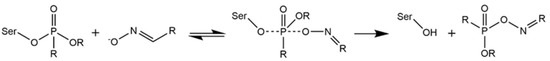 The exact mechanism of cholinesterase reactivation by an oxime involves a nucleophilic attack of the oxime ion on the OP phosphorus atom bound to serine (SER) in the enzyme active site (Figure 1). As a result, a transient oxime-OP-SER adduct with a trigonal bipyramidal geometry is created. Subsequently, the OP-SER bond is broken, which restores the catalytic activity of cholinesterase and releases the OP-oxime complex. This complex should have low affinity for the binding enzyme pocket to quickly dissociate from it without rephosphorylation or further enzyme blockade [16,19,20].