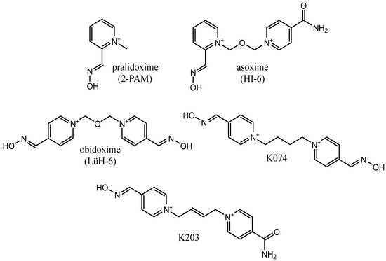 Effective reactivators, in addition to a strong nucleophilic moiety such as the oxime moiety, must also have elements that allow interaction with the enzyme active site and facilitate favorable positioning of the oxime fragment with respect to the OP phosphorus atom. These criteria are fulfilled by the strongest reactivators currently known, which are quaternary pyridinium cations with an aldoxime moiety substituted in position 2 or 4 of the pyridine ring. Due to the number of aromatic rings in the structure, they can be divided into monopyridinium and bispyridinium derivatives [21]. Examples of such reactivators are presented in Figure 2 [21,22,23].