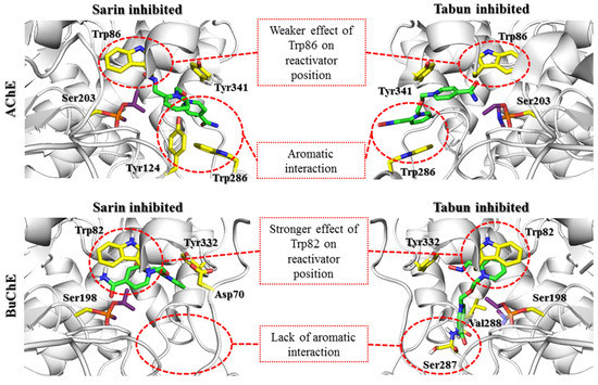 Obidoxime (Supplementary Materials Figure S2) in both complexes created cation-π and π-π interactions with Trp82 and Tyr332 and hydrogen bonds between the ionized oxime moiety and Tyr128. At physiological pH, the reactivator, which has two oxime groups, was mostly present in the form in which one group was dissociated and the other was not. This allowed for the creation of an additional hydrogen bond between the nonionized oxime group and the Pro285 backbone in the sarin-BuChE complex, and, in the case of tabun-BuChE, a hydrogen bond with the carboxyl group of Glu197 was observed.