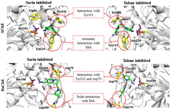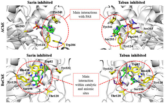 Docking results representing the prereactivation conformations of HI-6 (green) at the active sites of AChE and BuChE (gray) blocked by sarin and tabun (purple). The key amino acids involved in the interactions with the reactivator are marked with yellow sticks. The PAS region plays a huge role in ligand binding in both AChE and BuChE, despite the clear differences in the amino acids that build PAS of AChE and BuChE. Maintaining the BuChE prereactivation pose is dependent on the interaction with Tyr332 and Asp70. However, these interactions diminish during the formation of the transition state, in contrast to increasing interactions within the PAS AChE region.