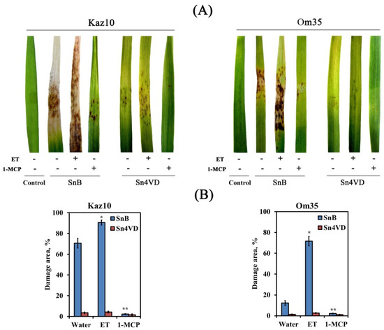 Reaction of Kazakhstanskaya 10 (Kaz10) and Omskaya 35 (Om35) wheat cultivars when inoculaed with virulent SnB and avirulent Sn4VD S. nodorum isolates after treatment with either ethephone (ET) or 1-methylcyclopropene (1-MCP). (A) Septoria nodorum blotch symptoms 8 days after inoculation. Photographs represent results of a typical variant from a series of experiments. (B) Damage zones on the leaves of Kaz10 and Om35 on the eighth day of inoculation, expressed as percent of the total leaf area. The samples are indicated as follows: Control—plants that have neither been treated nor inoculated with S. nodorum isolates; water—plants that have been sprayed with water; ET—plants that have been treated with ethephone (ET), releasing ethylene; 1-MCP—plants that have been treated with 1-methylcyclopropene (1-MCP), which is able to bind to ethylene receptors to block ethylene perception of. Figures present means ± SE (n = 30). Asterisks indicate means statistically different from the plants infected with S. nodorum without any pretreatments and different number of asterisks (* and **) allows distinguishing of significantly different variants according to the LSD test at * p < 0.05, ** p < 0.01.