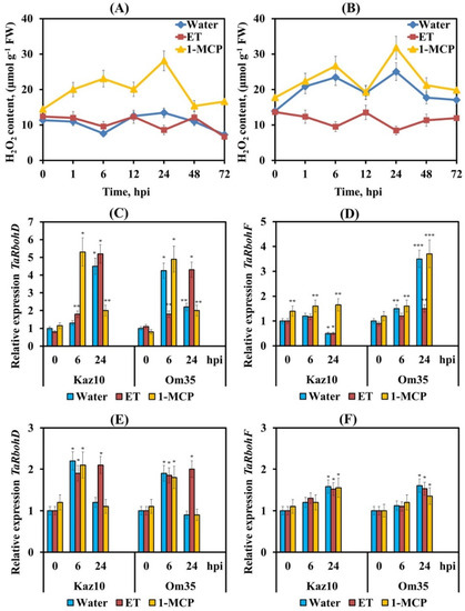 In our work, two peaks of H2O2 generation were found in SnTox3-insensitive plants Om35 infected with the isolate SnB at 6 and 24 hpi (Figure 3B). In the SnTox3-sensitive Kaz10 cultivar, no significant increase in the content of H2O2 was detected at the initial stage of infection (Figure 3A). Ethephon application suppressed the accumulation of H2O2 in both SnTox3-sensitive and SnTox3-insensitive plants at 6 and 24 hpi (Figure 3A,B). However, in the SnTox3-sensitive Kaz10 plants, the decrease in H2O2 content was more pronounced (Figure 3A). Conversely, exogenous 1-MCP application induced accumulation of H2O2 in leaves at 6 and 24 hpi in both Kaz10 and Om35 cultivars (Figure 3A,B). These results suggest that the change in the H2O2 content in infected wheat plants in our experiments completely depended on the activation or inhibition of the ethylene signaling pathway induced by SnTox3.
