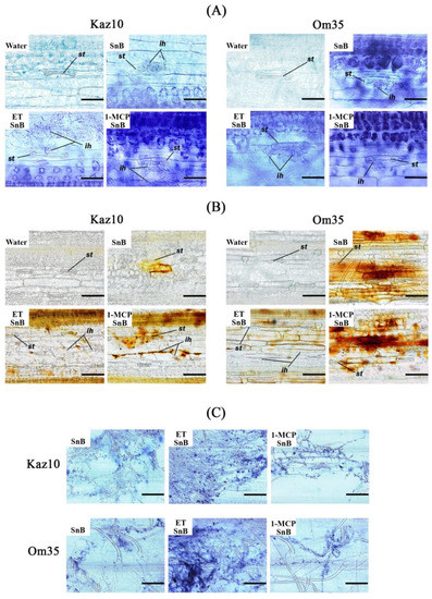 The effect of pretreatment with ethephone (ET) and 1-MCP on local generation of superoxide radical and H2O2 and growth of pathogen mycelium in leaves of Kaz10 and Om35 wheat cultivars infected with SnB. (A) Superoxide radical accumulation in infected leaves of Kaz10 and Om35 at 6 hpi detected with HBT staining. Bar = 50 µm. (B) H2O2 accumulation in infected leaves of Kaz10 and Om35 at 24 hpi detected with diaminobenzidine (DAB) staining. Bar = 100 µm. (C) The development of the S. nodorum mycelium on the leaves of Kaz10 and Om35 at 24 hpi detected with aniline blue staining. Bar = 50 µm. The variants are numbered as follows: water—noninfected plants; SnB—plants infected with the S. nodorum SnB; ETSnB—plants infected with S. nodorum SnB, treated with ethephone (ET); 1-MCPSnB—plants infected with S. nodorum SnB, treated with 1-methylcyclopropene (1-MCP). Photographs represent results of a typical variant from a series of experiments (n = 10). ih—infections hyphae; st—stomata.