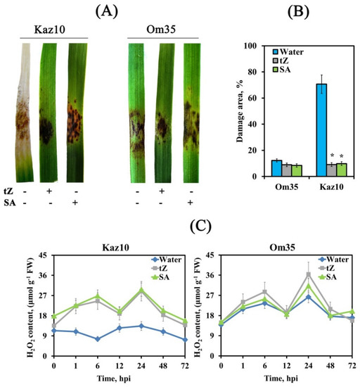 The pretreatment of trans-zeatin (tZ) and Salicylic acid (SA) induced an oxidative burst and reduced the damage zones on the leaves Kaz10 and Om35 cultivars infected with SnB. (A) Septoria nodorum blotch symptoms 8 days after inoculation. Photographs represent results of a typical variant from a series of experiments. (B) Damage zones on the leaves of Kaz10 and Om35 on the eighth day of inoculation, expressed as percentage of the total leaf area. Figures present means ± SE (n = 30). (C) H2O2 production in Kaz10 and Om35 infected with SnB in the dynamics of the infectious process. Figures present means ± SE (n = 6). The variants are indicated as follows: water—noninfected plants (0 hpi) or plants infected with the S. nodorum, which have been sprayed with water; tZ—noninfected plants (0 hpi) or plants infected with S. nodorum, treated with trans-zeatin; SA—uninfected plants (0 hpi) or plants infected with S. nodorum, treated with salicylic acid. Asterisks indicate means statistically different from the control group infected with S. nodorum without any pretreatments according to the LSD test at p < 0.05.