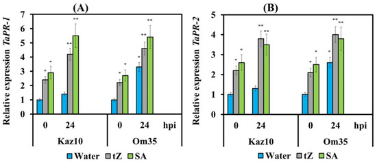 The effect of pretreatment with tZ and SA on the relative expression of salicylate signaling pathway marker genes TaPR-1 and TAPR-2 in Om35 and Kaz10 infected with SnB. (A) The mRNA abundance of the TaPR-1 gene. (B) TaPR-2 gene. Expression values are normalized to the housekeeping gene TaRLI as an internal reference and expressed relative to the normalized expression levels in mock-treated control (water) plants at 0 hpi. Symbols are the same as in Figure 5. Figures present means ± SE (n = 6). Asterisks indicate means statistically different from the control and different number of asterisks (*, **) allows distinguishing of significantly different variants according to the LSD test at * p < 0.05, ** p < 0.01.