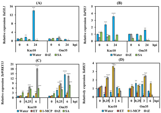 We have studied individual elements involved in the signaling pathways of ethylene, CK, and SA under the influence of treatment with ET, 1-MCP, SA, and trans-zeatin in plants of the Om35 and Kaz10 cultivars. In this work, we studied the TFs ERF1 (TaPIE1) and EIN3 (TaEIL1) as elements of the ethylene signaling pathway [50,51], the type-B cytokinin response regulator TaRR21 which is an ortholog of the Arabidopsis gene ARR2 [52], and TaWRKY13 as a marker of the development of the SA signaling pathway which is an ortholog of the Arabidopsis gene AtWRKY70 [53]. (Table S2, see Supplementary Materials).