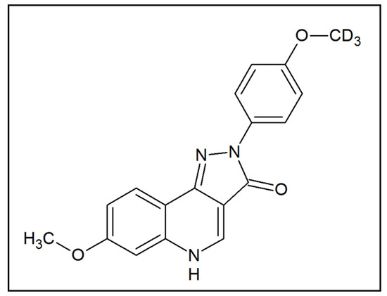 Emerging preclinical evidence suggests that the activation of GABAA receptors containing α6 subunits (α6 GABAARs) may be a potential therapeutic agent for tic disorders. Specifically, it was demonstrated that positive allosteric modulators (PAMs) of these receptors oppose the PPI deficits induced by the potent dopamine releaser methamphetamine [15]. Although these data are promising, PPI deficits are not pathognomonic of TS, but are exhibited across a wide range of heterogeneous neuropsychiatric disorders, including schizophrenia, mania, and obsessive-compulsive disorder (OCD) [16]. To understand whether this category of compounds may also reduce tics, the present study was designed to assess the therapeutic potential of the pyrazoloquinolinone DK-I-56-1 (7-methoxy-2-(4-methoxy-d3-phenyl)-2,5-dihydro-3H-pyrazolo[4,3-c]quinolin-3-one) (Figure 1), a highly selective and potent PAM of α6 GABAARs [17]. This compound was developed as a stable analog of the α6 GABAAR PAM PZ-II-029, with enhanced bioavailability and a similar lack of cytotoxic, hepatotoxic, or sedative effects [17,18].
