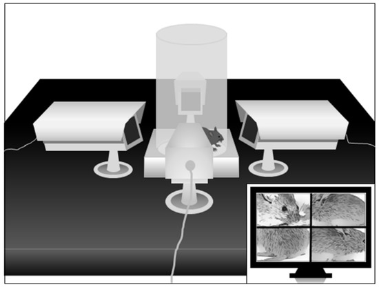 Spontaneous eye blinking. Eye blinking was studied by placing mice in the same cylinder used for spatial confinement, mounted on a square platform adjacent to four video cameras placed on each of the four sides in close proximity to the cylinder, as shown in Figure 2. This configuration allows experimenters to monitor eyeblinks remotely and continuously, in a non-invasive fashion, and without the employment of head restraint bars. To minimize stress, animals were exposed to the apparatus for 3 days before testing, and the actual testing session was limited to 5 min. Eyeblinks and grooming stereotypies were scored by trained observers blind to treatment groups, using Behavioral Tracker. Treatments were randomly assigned to each experimental group.