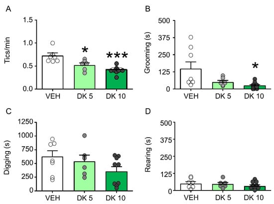 Effects of DK-I-56-1 (DK) on Tourette Syndrome-related motoric responses in D1CT-7 mice exposed to spatial confinement. DK significantly reduced (A) tic-like responses (F(2,15) = 9.66, p = 0.002) and the duration of (B) grooming behavior (F(2,19) = 4.48; p = 0.03), but not (C) digging or (D) rearing. All analyses were performed by one-way ANOVAs. Significance refers to the results of post-hoc comparisons. * p < 0.05; *** p < 0.001 in comparison with vehicle (VEH). n = 6–8/group. Doses are indicated in mg/kg (IP). For further details, see text.