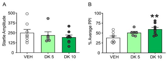 Effects of DK-I-56-1 (DK, 5, 10 mg/kg, IP) on (A) startle response and B) prepulse inhibition (PPI) (B) in D1CT-7 mice exposed to spatial confinement. DK had no effects on startle amplitude but restored PPI (F(2,19) = 6.05; p = 0.009). All analyses were performed by one-way ANOVAs. Significance refers to the results of post-hoc comparisons. ** p < 0.01. n = 6–8/group. For further details, see text.