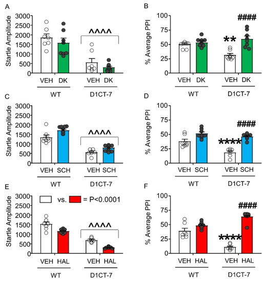 Next, we analyzed the effect of DK-I-56-1, SCH 23390, and HAL on the startle response of D1CT-7 and WT mice. DK-I-56-1 did not alter the startle amplitude of either genotype, even though a significant reduction in startle reflex was found in D1CT-7 mice compared with WT littermates (Figure 6A). However, this drug reversed the PPI deficits observed in D1CT-7 mice without affecting this index in WT littermates (Figure 6B). Similar to DK-I-56-1, SCH 23390 did not affect startle amplitude (Figure 6C) but reversed the PPI deficits observed in D1CT-7 mice (Figure 6D). Finally, HAL was found to reduce startle amplitude in both genotypes, but this effect was not genotype-specific (Figure 6E). As expected, HAL reversed the PPI deficits observed in D1CT-7 mice (Figure 6F).