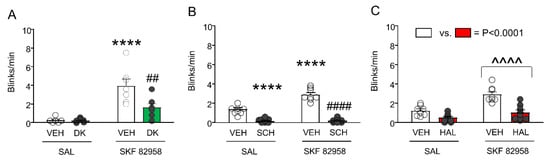 Effects of DK-I-56-1 (DK, 10 mg/kg, IP) and dopaminergic antagonists on the exacerbation of spontaneous eye blinking in C57BL/6 mice treated with SKF 82958 (0.5 mg/kg, IP). (A) Two-way ANOVA showed that SKF 82958 significantly increased eye blinking (Main effect: F(1,22) = 31.45, p = 0.00001), while DK reduced it (Main effect: F(1,22) = 6.75, p = 0.02). A significant interaction between the two treatments was found (F(1,22) = 6.37, p = 0.02), revealing that DK significantly reduced the blinks in mice treated with SKF 82958. (B) The D1 antagonist SCH 23390 (0.5 mg/kg, IP) also countered the elevation in eyeblinks caused by SKF 82958 (Main effect of SKF 82958: F(1,30) = 28.68, p < 0.00001; Main effect of SCH 23390: F(1,30) = 181.6, p < 0.00001; Interaction: F(1,30) = 25.10, p = 0.00002). (C) The D2 antagonist haloperidol (HAL, 0.5 mg/kg, IP) reduced eyeblinks, but this effect did not interact with the elevation of eyeblinks induced by SKF 82958. (Main effect of SKF 82958: F(1,28) = 22.98, p = 0.00005; Main effect of HAL: F(1,28) = 25.59, p = 0.00002; Interaction: F(1,28) = 2.79, NS). ^^^^ p < 0.0001 main effect of SKF 82958 vs. saline (SAL); **** p < 0.0001 vs. mice treated with VEH and SAL; ## p = 0.001 and #### p < 0.0001 vs. mice treated with VEH. n = 6–8/group. For further details, see text.