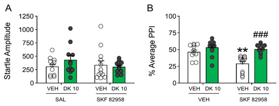 Building on these results, we then assessed whether DK-I-56-1 could reduce PPI deficits induced by SKF 82958 (0.5 mg/kg, IP) (Figure 8). The analysis of startle amplitude revealed that neither DK-I-56-1 nor SKF 82958 significantly modified this response (Figure 8A). Conversely, SKF 82958 dramatically reduced PPI; furthermore, DK-I-56-1 countered the PPI deficits caused by the D1 receptor agonist (Figure 8B).