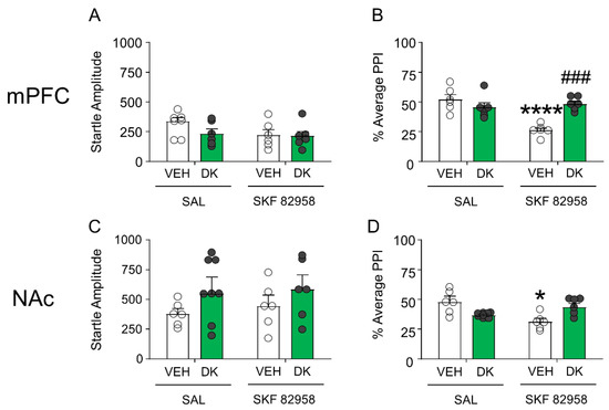 DK-I-56-1 (DK, 10 nmol) infusion in the medial prefrontal cortex (mPFC) (A) failed to affect startle reflex in mice, but (B) significantly countered the PPI deficits produced by SKF 82958 (F(1,20) = 19.34; p = 0.0003). Conversely, infusions of this drug in the nucleus accumbens (NAc) (C) did not affect startle amplitude, and (D) failed to reverse the PPI deficits induced by SKF 82958. All analyses were performed by 2-way ANOVAs. Significance levels refer to the results of post-hoc comparisons. * p < 0.05; **** p < 0.0001 vs. mice treated with the vehicle of DK (VEH) and saline (SAL, controlling for SKF 82958); ### p = 0.0001 vs. mice treated with VEH and SKF 82958. n = 6–8/group. For further details, see text.