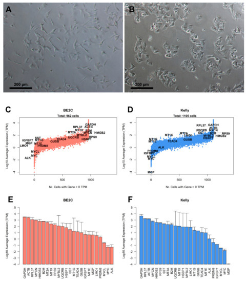 Initial analysis of single-cell expression on Kelly and BE2C cell lines. (A) BE2C and (B) Kelly cells prior to library preparation sequencing. (C,D) Plot showing the Log10 TPM average expression for all genes in the dataset (y-axis) and the number of cells where the gene is detected (x-axis) with TPM > 0 (i.e., more than one read) in BE2C and Kelly cells. (E,F) Selected representative genes shown as bar plots of overall log10 TPM average expression, with error bars depicting standard deviation in the dataset for BE2C and Kelly cells. A pseudovalue of 0.0001 (10−4) is added to TPM values (also in the next figures) prior to calculation of logarithm.