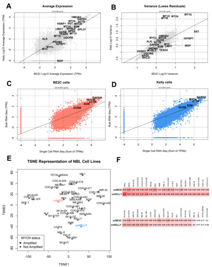 Comparison between BE2C and Kelly datasets and with bulk RNA-Seq. (A) Gene-by-gene comparison of log10 TPM average expression in BE2C (x-axis) and Kelly cells (y-axis). A linear regression line is shown, and the SCC is indicated with the correlation p-value (precision limit: 10-302). (B) Gene-by-gene comparison of log10 TPM variance of expression (after regressing out average expression with a loess regression) in BE2C cells (x-axis) and Kelly cells (y-axis). (C,D) Gene-by-gene comparison between single-cell dataset expression (x-axis, shown as log10 sum of TPMs) and bulk expression (y-axis, as log10 TPM expression of the cell line in the Harenza dataset [24]). The Spearman Correlation Coefficient (CC) is indicated. (E) TSNE visualization (calculated on TPM data) including the entire Harenza bulk RNA-Seq dataset [24] and the sum of TPMs of single-cell datasets. MYCN-amplified NBL cell lines are depicted as squares, not-MYCN-amplified cell lines as circles. (F) Heatmap reporting Spearman Correlation Coefficient between single-cell aggregated TPM data and 20 bulk RNA-Seq samples from the Harenza dataset. Samples are ordered by correlation coefficient with the scKelly sample, and reported in two rows for graphical convenience.