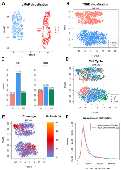 Visualization of single cells following dimensionality reduction. (A) UMAP and (B) TSNE representations of BE2C (red) and Kelly (blue) cells. Clustering assignment according to the Louvain method (high resolution parameters) is indicated (BE2C cells are divided into light and dark red). The numbers in panel A (0, 1, 2) correspond to inferred clusters. (C) Distribution of cells by predicted cell cycle phase. (D) Overlay of cell cycle phase over coordinates from panel B. (E) Overlay of nr of mapped reads (in thousands) per cell over coordinates from panel B. (F) Distribution of mapped reads/cell across the two single-cell datasets; x-axis: number of reads, y-axis: relative abundance of cells.