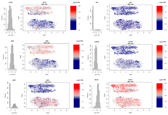 Our dataset can be used to detect the heterogeneity of expression of specific genes within the cell populations, in terms of Log10 TPM (Figure 4). The housekeeping ACTB gene is more expressed in BE2C cells (Figure 4, cluster above), and ranges within one order of magnitude of expression (roughly 630-9772 in non-logarithmic scale TPM). Similar considerations can be applied to the other two housekeeping genes, B2M and GAPDH. ALK displayed low expression levels in the majority of the dataset, while both LMO1 and MYCN show notable differences across the dataset. Overall, this dataset shows an unprecedented variability of gene expression within MYCN-Amplified cell lines, which supports further investigation of cancer cell line models via single-cell sequencing.