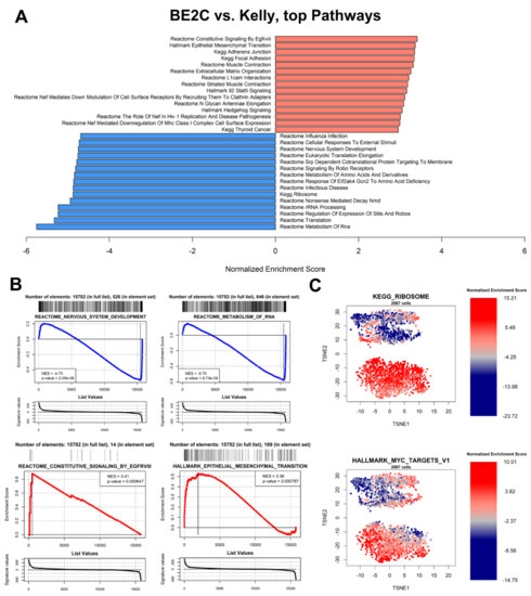 We analyzed pathway enrichment both as a comparison between BE2C cells and Kelly cells, and within each cell (Figure 5). The overall analysis highlights that BE2C cells have a markedly higher expression of genes associated to Epithelial-Mesenchymal Transition (EMT) (Figure 5A,B), a pathway generally associated with higher proliferation, chance of metastasis, poor survival, and drug resistance [52]: it can be hypothesized therefore that BE2C cells are a better model for highly aggressive MYCN-amplified NBL than Kelly cells. Another strongly upregulated BE2C-specific pathway is the signaling downstream of EGFRvIII, a mutated version of EGFR lacking ligand binding domain, often amplified in tumors [53] (Figure 5B). On the other hand, as discussed in the previous section, Kelly and BE2C differ in the expression of ribosomal protein-coding genes (Figure 5A): a marked upregulation of rRNA metabolism and protein translation was observed in Kelly cells (Figure 5A,B). Kelly and BE2C cells differ dramatically in the Reactome-defined pathway “Nervous System Development” (Figure 5B) [39], which is upregulated in Kelly, indicating a higher differentiation of these cells compared to BE2C, which is supported by the higher mesenchymal pattern of BE2C cells (Figure 5B), according to GSEA profiling.