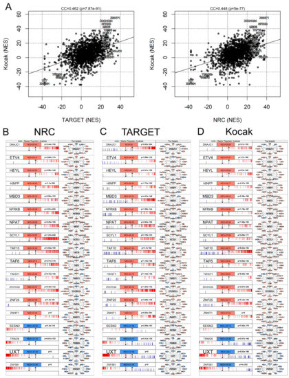 BE2C vs. Kelly master regulator analysis (MRA). (A) Comparison between MRA scores derived using the Kocak-based network (y-axis) [52], and the networks derived from TARGET and NRC datasets (x-axis) [22]. Master regulator scores, as plotted and defined by the corto R package [31] and expressed as NES, based on networks derived from (B) the Kocak dataset [52], (C) the TARGET dataset [22] and (D) the NRC dataset [22].