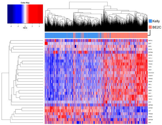 Some of these differences are of notable relevance to NBL pathogenesis: one example is SESN2, upregulated in Kelly cells, a regulator of mTORC1. High levels of SESN2 are associated with apoptosis, while low levels are associated with drug resistance [60,61]. Another example is TWIST1, upregulated in BE2C cells, a direct coeffector of the MYCN pathway in NBL [62]. Other transcription factors are associated with cancer-related pathways, such as NPAT [63], ZNF264 [64], HEYL [65] and ETV4 [66].