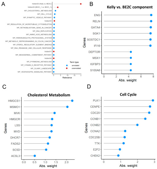 Dissection of heterogeneity in the single-cell dataset, according to the f-scLVM algorithm [69] based on known pathway annotations available from Wiki Pathways [70] and MsigDB [37]. (A) Graph showing the most relevant factors identified by the f-scLVM model, both annotated in Wiki Pathways (blue) or not annotated (red). (B–D) Loadings of the most influential genes in (B) “hidden02, Kelly vs. BE2C”, (C) “cholesterol metabolism” and (D) “cell cycle” terms, defined by the Absolute Weight parameter of the f-scLVM method.
