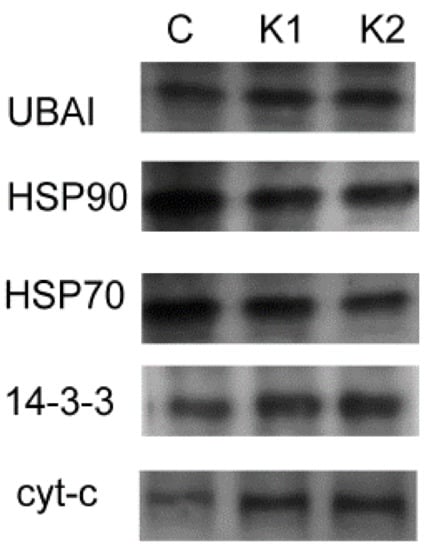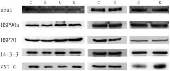 To verify the results from the proteomics, we treated the HepG2 cells with 10 μm kaempferitrin, collected and filtered the conditioned medium, 0.22 μm and concentrated with 3D flow through column. Among the five differentially expressed exosomal marker proteins, we tested the UBA1, HSP90a, and 14-3-3 epsilon. We also tested HSP70, as the known marker for the exosome for its expression and Cytochrome C protein levels. According to our observation from Figure 1, HSP90a and HSP70 were down-regulated, which corroborated with the proteomic data, while UBA1 was up-regulated in both samples, and 14-3-3-epsilon was up-regulated in one of the samples, which did not corroborate with the proteomic data. Cytochrome C was up-regulated as reported in the proteomic analysis.