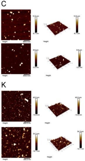 Representative photos for EVs viewed under Brucker Dimension Icon. C: Controls. K: kaempferitrin treated. Two views were presented for each treatment. The left columns are the height channels. The middle column shows the height in the 3D configuration with slight tilt in the xy-axis. The white to black scales demonstrate the measurement of height in Z-axis and was represented with the white designated for the highest point. Note the height of the EVs on the Z axis was 15.5 and 8.9 nm while those for the kaempferitrin-treated are 40.0 and 34.3 nm.