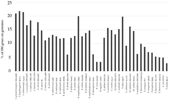 Percentage of genes relating to the entire number of mapped genes in the genome of the selected bacteria. The genome mining approach was carried out with antiSMASH []. A total of 42 bacteria were investigated for their potential to harbor silent biosynthetic gene clusters (BGCs) in their genome. The complete list of bacteria is presented in the supplement (Table S1). SM, secondary metabolite.
