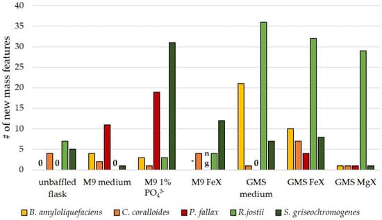 An increased number of mass features was detected in PO43−-limitation experiments. This relates to the common assumption that high PO43−-concentrations act as repressors of SMs, whereas a limited PO43−-concentration is more preferable for secondary metabolism [,]. Masuma et al. showed that phosphate reduction enhanced antibiotic production in Streptomyces rosa []. S. griseochromogenes and P. fallax are more susceptible to the PO43−-limitation than the other tested strains, as demonstrated by the high numbers of new mass features obtained under this condition. R. jostii reacted strongly to any variation of GMS medium with up to 36 new mass features.