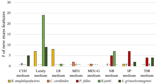 Number of new mass features in extracts of nutrient-rich media experiments. The ‘-’ indicates not tested with this bacterium, the ’0’ related to no new mass features compared with the control group ‘c’. Any new mass feature had to be present in both biological duplicates and its MS signal had to surpass an intensity of 105 to be considered for the number of new mass features presented in this diagram. Therefore, this diagram only shows the number of reproducibly detected mass features.