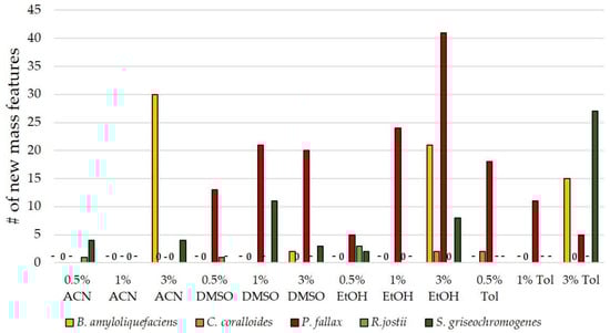 The analysis of the extracts of OSMAC conditions in the presence of solvents showed heterogeneous results across the selected strains. While C. coralloides was unsusceptible to almost all tested solvents and concentrations, P. fallax displayed up to 41 new mass features in the presence of DMSO, ethanol, and toluene (Figure 4). S. griseochromogenes responded with new mass features to all tested organic solvent additives. B. amyloliquefaciens reached between 15 and 30 new mass features in response to toluene, ethanol, and acetonitrile, but only produced 2 new mass features when supplemented with DMSO. This confirms the observation of Chen et al. that the solvent effects are highly dependent on the microbe’s stress tolerance []. Different tolerance mechanisms have been proposed for ethanol and DMSO, among them the action on the translational level and change of membrane structure, but no definite statement can be given at this point [,]. In sum, the OSMAC approach with solvent addition is a promising route to discover new SMs. Particularly, more organic solvents should be tested for their potential to increase the number of mass features as a proxy of new SMs.