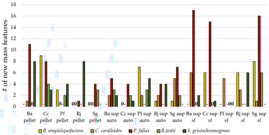 It has been shown in manifold research papers that co-cultivation is a productive way of exploiting the biosynthetic potential of microbes []. Several small molecules produced by one organism are bioactive in other organisms. For example, acyl homoserine lactones are actively involved in proteobacteria signaling and peptides are known as signaling molecules in gram-positive bacteria []. Moreover, the addition of supernatants and culture extracts, or the use of heat-killed cells, were successful in generating SMs [,]. However, the use of such biotic additives has not been widely exploited to mimic the presence of signal molecules and surface proteins to trigger a metabolic response in microorganisms. In order to study the influence of biotic additives on SM production, sterile-filtered and autoclaved supernatants obtained from various bacterial strains were added to bacterial cultures. New mass features were generated in both experimental setups in all tested strains (Figure 5). In general, we observed that pretreatment of bioactive additives had a minor influence on the number of mass features. The addition of sterile-filtered supernatant did not generally lead to a higher number of new mass features compared with the autoclaved supernatant. It is likely that most signaling molecules were sufficiently temperature-stable during the autoclaving process.