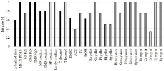Hit rates for all tested culture conditions. Black bars: sample size n = 5 strains, dark grey bars: n = 4, light grey bars: n = 3.