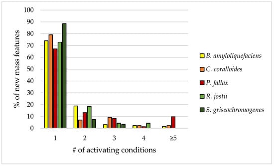 Our analysis also shows that, in most tested strains, more than 70% of the generated new mass features were produced under exactly one of the tested culture conditions (condition-specific). Between 7 and 19% of the new mass features were generated under two culture conditions, and even less under three or more culture conditions (Figure 7).