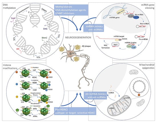 - Esposito, M.; Sherr, G.L. Epigenetic modifications in Alzheimer’s neuropathology and therapeutics. Front. Neurosci. 2019, 13, 476–490. [Google Scholar] [CrossRef] [PubMed]