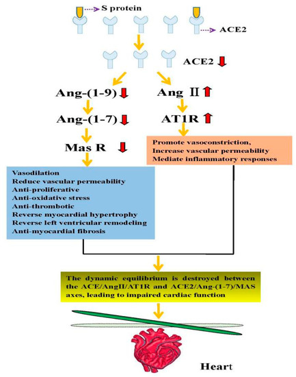 On ACE2 is a metalloproteinase with a total length of 805 amino acids, including a 17-amino-acid N-terminal signal peptide (one zinc-binding motif) and a C-terminal membrane anchor [35,36]. A unique collectrin domain is also included. Although ACE2 and ACE are homologs and are both parts of the RAS, their actions are opposite [37]. ACE can convert angiotensin (Ang) I into Ang II, which can activate the G protein-coupled receptor angiotensin II type 1 receptor (AT1R) to promote vasoconstriction, increase vascular permeability, and mediate inflammatory responses. ACE2 can cleave Ang I and produce Ang-(1-9) peptide that can be transformed into vasodilator peptide Ang-(1-7) through ACE and other peptidases. In addition, ACE2 can hydrolyze Ang II into Ang-(1-7). In turn, the latter can act on Mas receptors to achieve vasodilation; reduce vascular permeability; exert antiproliferative, antioxidant, and antithrombotic effects; and reverse myocardial hypertrophy, left ventricular remodeling, and myocardial fibrosis. Therefore, it exerts essential functions in the cardiovascular system [38,39,40]. In the human body’s normal physiological state, the ACE2/Ang-(1-7)/MAS and ACE/Ang II/AT1R axes are in a state of dynamic equilibrium, thereby maintaining the normal functioning of the heart.